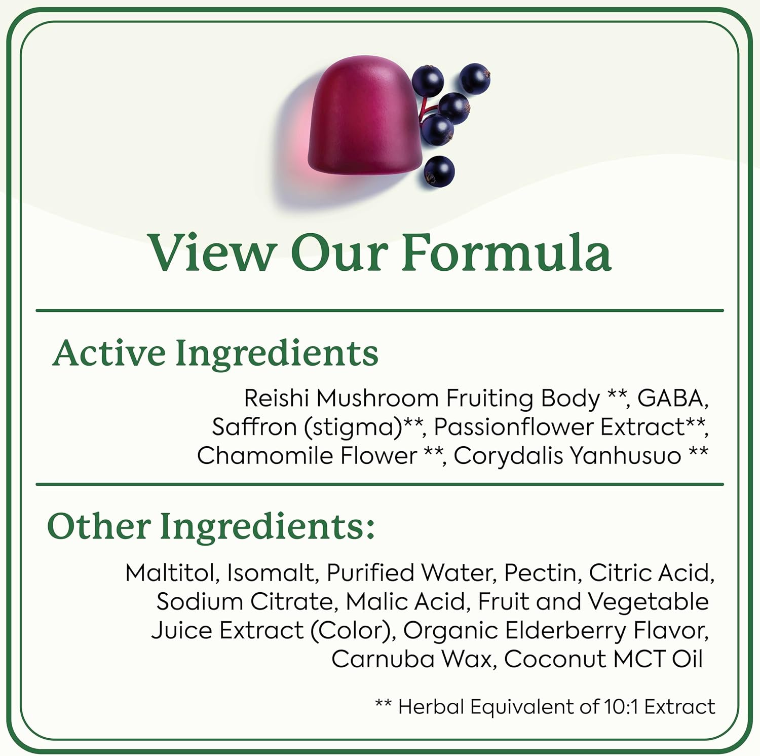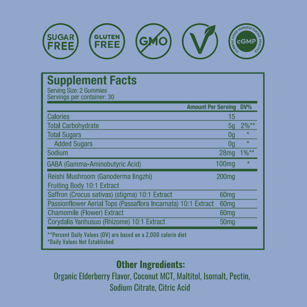 Each serving contains a 4,300mg/serving of Saffron, Reishi, Corydalis, GABA, Chamomile and Passionflower. 60 gummies per pouch. 30-night supply.